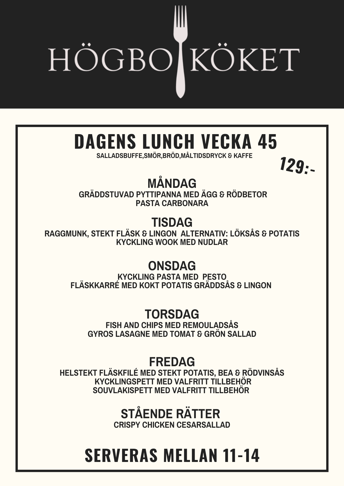 På Högboköket serverar vi smakfulla rätter som kolgrill, hamburgare, sallader, à la carte pasta, kebab och pizza. Här finns något för alla smaker. Välkommen att njuta av god mat i en trevlig och avslappnad atmosfär!